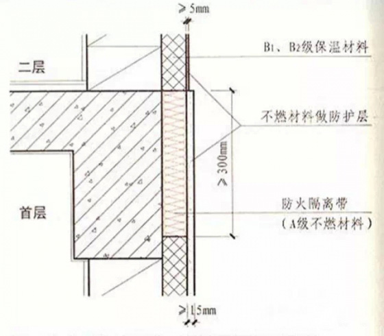 5.在保溫系統(tǒng)中每層應設(shè)置高度不小于300毫米且燃燒性能為A級的水平防火隔離帶。防護層厚度首層不應小于15毫米,其它層不應小于5毫米。