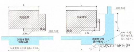 1)高層建筑應至少沿一個長邊或周邊長度的l/4且不小于一個長邊長度的底邊連續(xù)布置消防車登高操作場地,該范圍內(nèi)的裙房進深不應大于4米;
