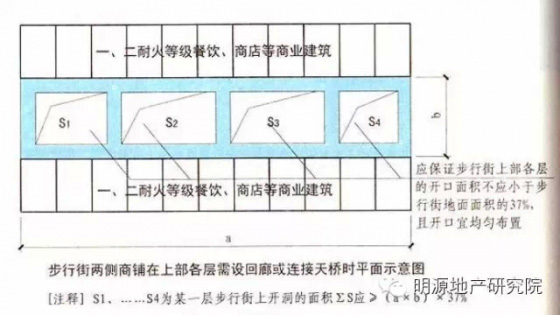 6.步行街兩側(cè)的商鋪在上部各層需設(shè)置回廊和連接天橋時,應保證步行街上部各層樓板的開口面積不應小于步行街地面面積的37%,且開口宜均勻布置;